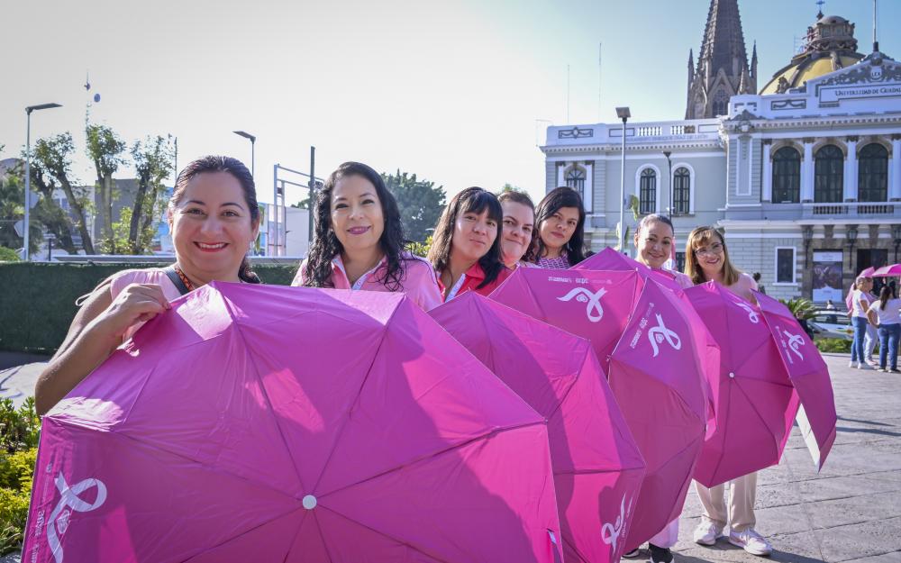 La explanada del edificio de la Rectoría General de la Universidad de Guadalajara se pintó de rosa para recordar el Día Internacional de la lucha contra el Cáncer de Mama, que se conmemora cada 19 de octubre y que pretende sensibilizar y concientizar a la población sobre esta enfermedad que ataca principalmente a las mujeres.