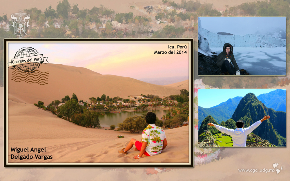 "El conocer el oasis de la Huacachina en Ica me permitió vivir una aventura realmente increíble, pude practicar sandboarding en sus dunas, así como disfrutar de un paisaje verdaderamente único en el mundo. La fotografía muestra uno de tantos paisajes en los que se aprecia lo hermoso que es Perú.